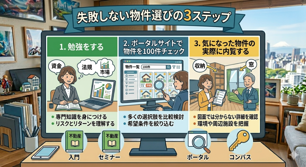 - 始める前に「勉強 → 100件見る → 内見する」の3ステップを踏もう