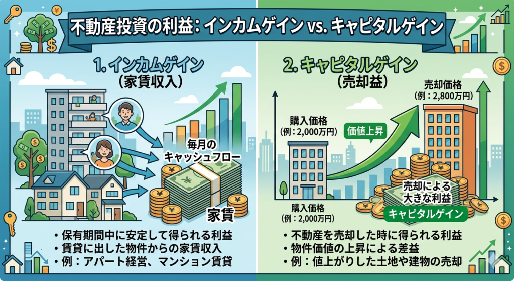 - 不動産投資の収益には「インカムゲイン(家賃)」と「キャピタルゲイン(売却益)」がある