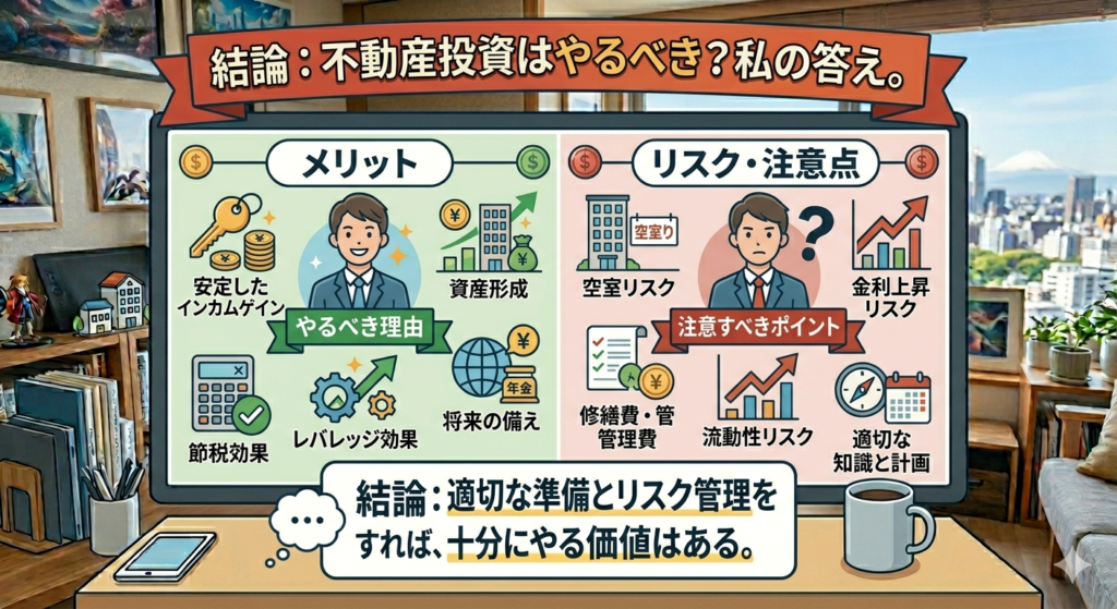 最後に、この記事のまとめとして「不動産投資はやるべきか?」という問いに、私の答えをお伝えします。